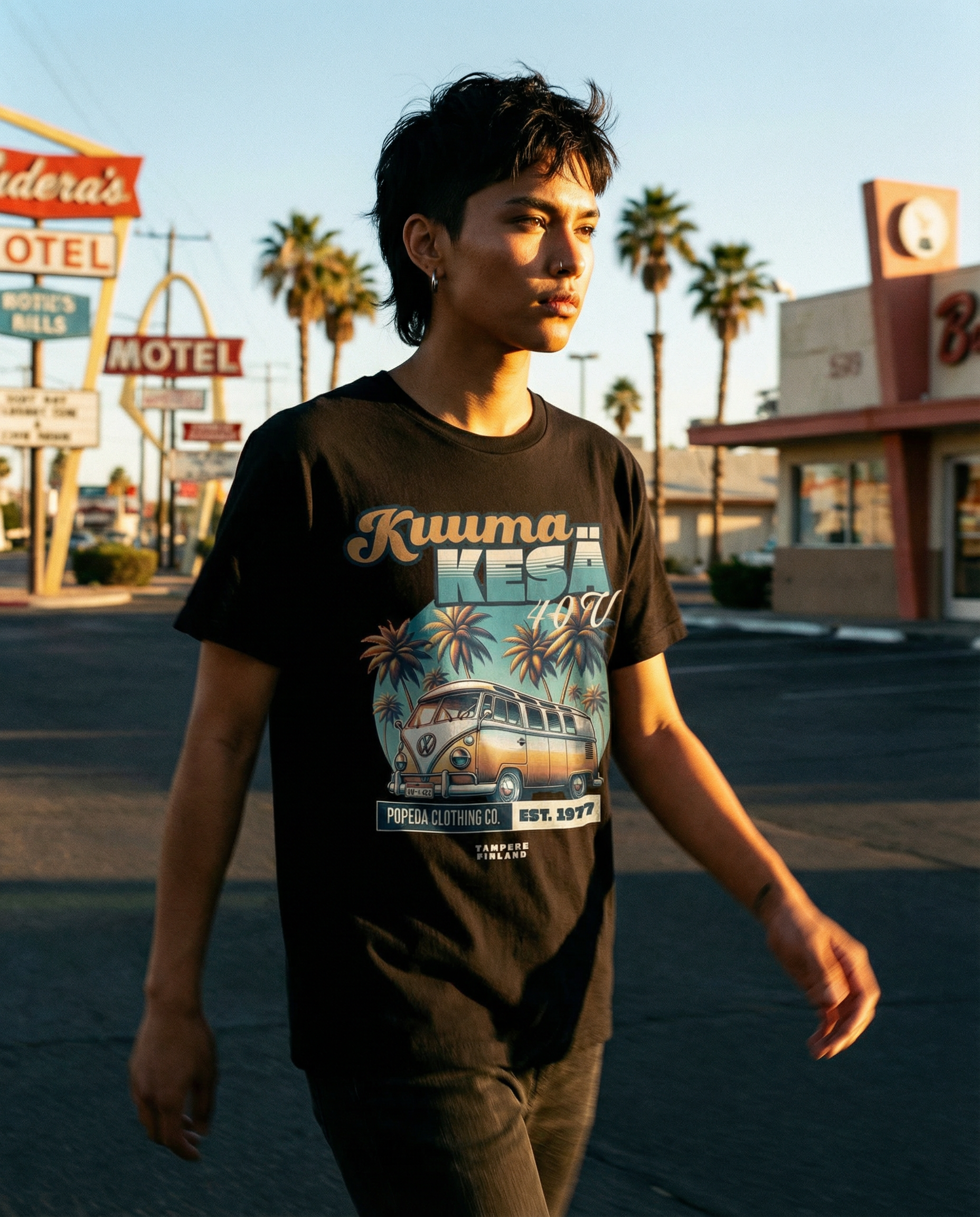 Juhlista Popedan legendaarista hittikappaletta Kuuma kesä, joka täyttää 40 vuotta! Tämä tyylikäs ja korkealaatuinen Popeda T-paita on kunnianosoitus suomalaiselle rock-historialle – täydellinen valinta kesään 2025. Ikoninen VW Kleinbus ja auringonlasku tuovat paidalle kesäisen fiiliksen – juuri kuten Kuuma kesä -klassikossa.